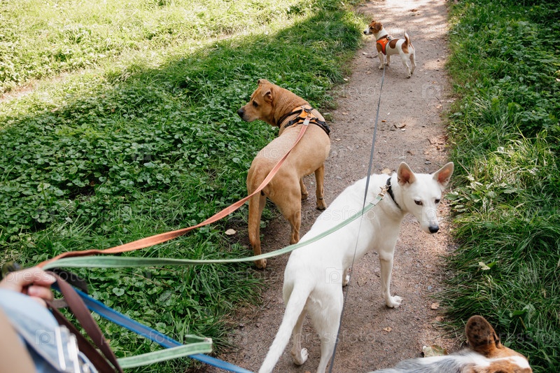 Собаки гуляют в парке. профессиональный петух или няня, упаковывая животных на зеленой лужайке