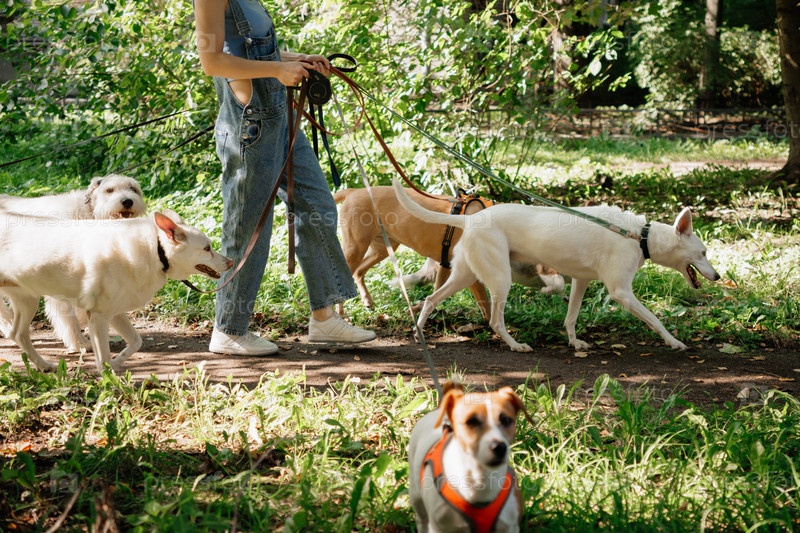 Собаки гуляют в парке. профессиональный петух или няня, упаковывая животных на зеленой лужайке