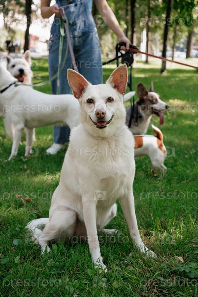 Белая собака в парке на прогулке с хозяином. гулять и тренировать домашних животных днем