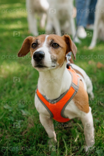 Собака-терьер Джек Расселл в парке на проводе со своим хозяином