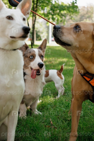 Белая собака в парке на прогулке с хозяином. гулять и тренировать домашних животных днем