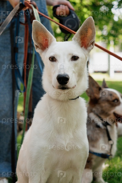 Белая собака в парке на прогулке с хозяином. гулять и тренировать домашних животных днем