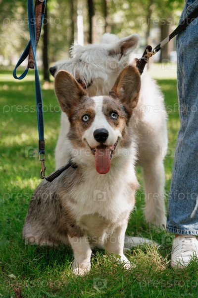 Прогулки собаки, хозяин гуляет по лужайке в парке с корги-собаками