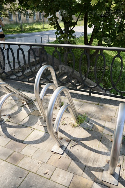 Металлическая велосипедная стоянка в деловой части города или в парке, серый красочный снежно-белый прилавок