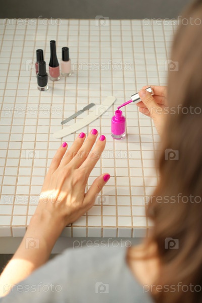 Женщина красит ногти дома, маникюр ухаживает за руками. ярко-розовый лак для ногтей