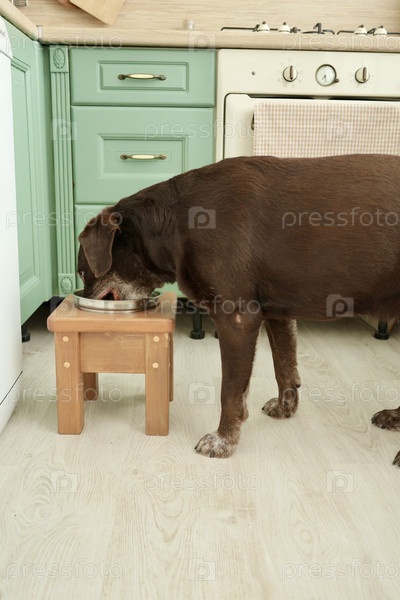 Лабрадор ретривер собака ест из миски на стоянке. комфортное кормление домашних животных. собачий стул,