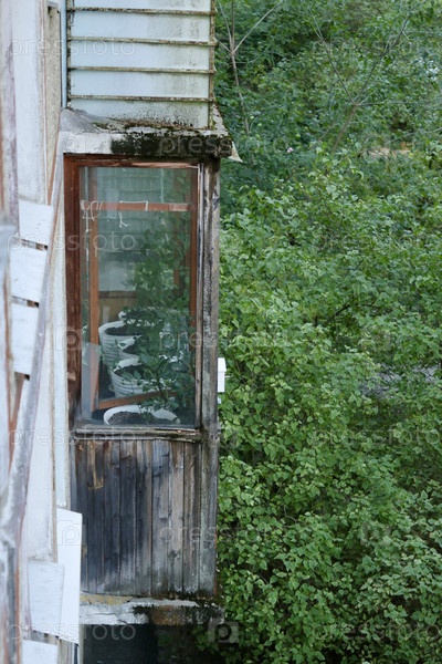 Старый балкон, фасад дома в плохом состоянии. ветхое помещение заброшенных домов