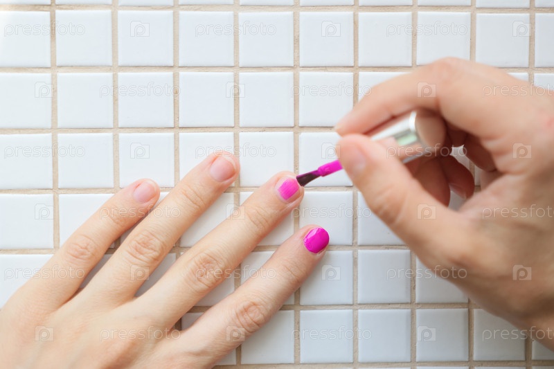 Женщина красит ногти дома, маникюр ухаживает за руками. ярко-розовый лак для ногтей