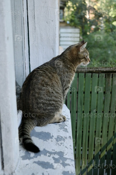 Милый кот сидит на балконе или террасе. Близкий портрет коричневого питомца