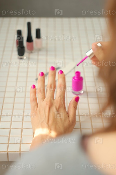 Женщина красит ногти дома, маникюр ухаживает за руками. ярко-розовый лак для ногтей