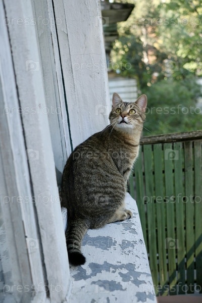 Милый кот сидит на балконе или террасе. Близкий портрет коричневого питомца