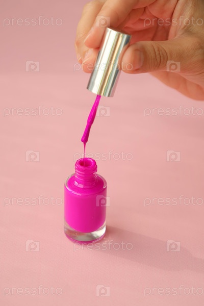 Розовый лак для ногтей с бутылкой и кистью на розовом фоне, вид сверху. женщина красит свои ногти