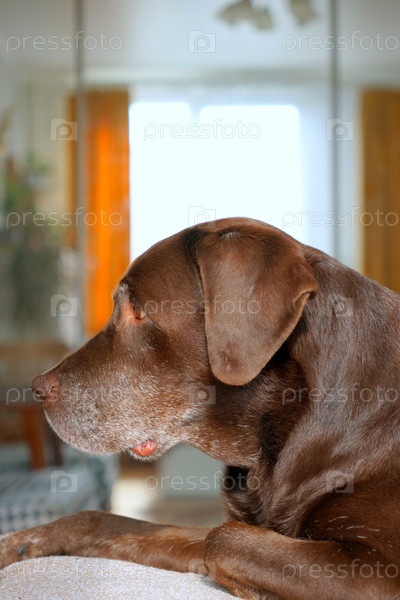 Милый шоколадный лабрадор ретривер лежит на кровати и отдыхает. ближайшее изображение домашнего питомца, спящего на диване