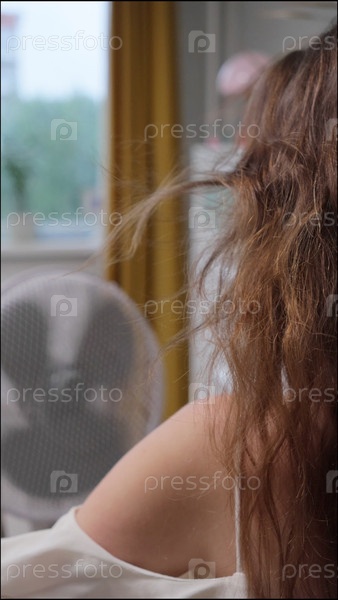 Женщина страдает от летней жары дома и сидит перед ветряным вентилятором