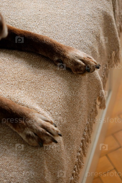 Милый шоколадный лабрадор ретривер лежит на кровати. крупные лапы домашнего питомца, спящего на диване