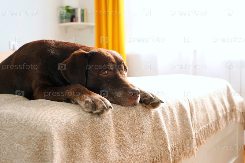 Милый шоколадный лабрадор ретривер лежит на кровати и отдыхает. ближайшее изображение домашнего питомца, спящего на диване