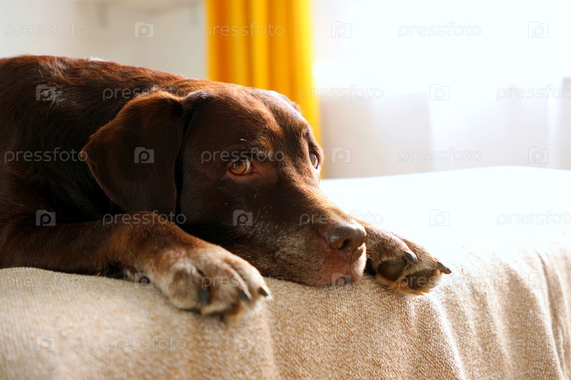 Милый шоколадный лабрадор ретривер лежит на кровати и отдыхает. ближайшее изображение домашнего питомца, спящего на диване