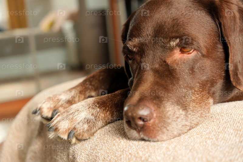 Милый шоколадный лабрадор ретривер лежит на кровати и отдыхает. ближайшее изображение домашнего питомца, спящего на диване