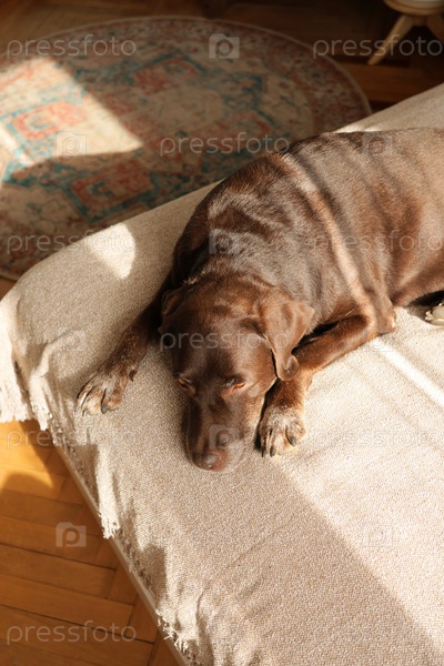 Старый шоколадный пес Лабрадор ретривер лежит на кровати и отдыхает. ближайший снимок питомца