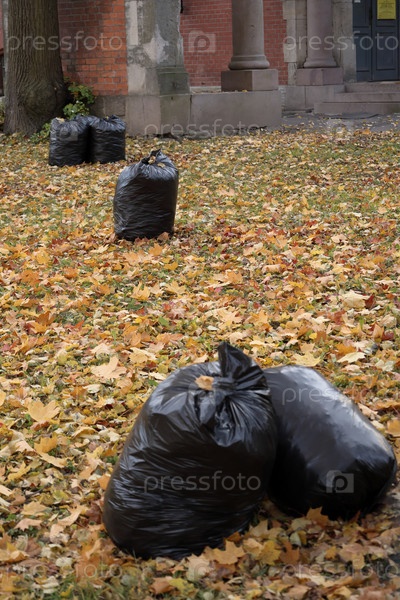 Мусор в черных пластиковых пакетах в саду, во дворе. уборка территории дома в осенний сезон