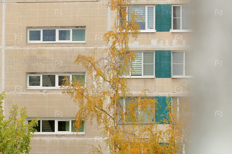 Дерево во дворе многоэтажного здания. улучшение территории небоскреба