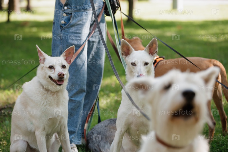 Профессиональный заводчик собак или няня выгуливает стадо милых собак разных пород