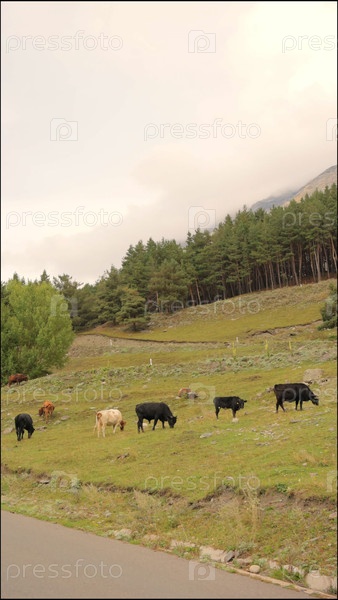 Коровы пасутся в горах, большая красная ферма корова или стадо ест траву у подножия холмов