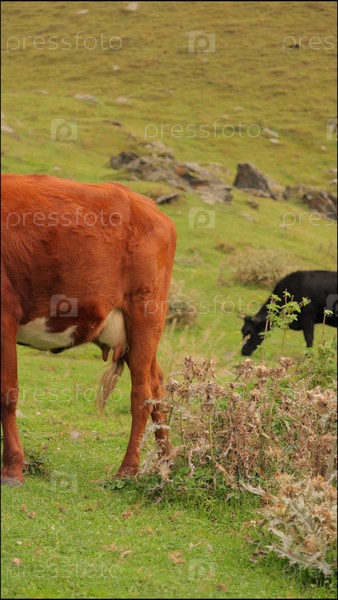 Коровы пасутся в горах, большая красная ферма корова или стадо ест траву у подножия холмов
