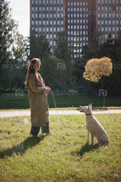 Молодая женщина гуляет с белой собакой в парке. леди в бежевом плаще обнимает хаски на зеленой лужайке