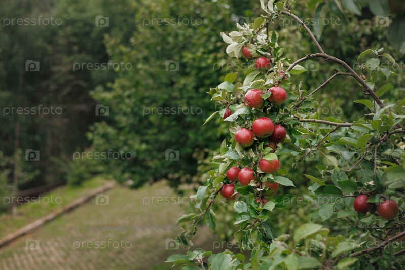 Зрелые красные яблоки висят на ветке, украшенной зелеными листьями