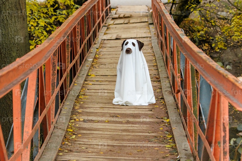 Лабрадор Хэллоуин собака одета в костюм призрака, питомец в белом плаще сидит на деревянном мосту