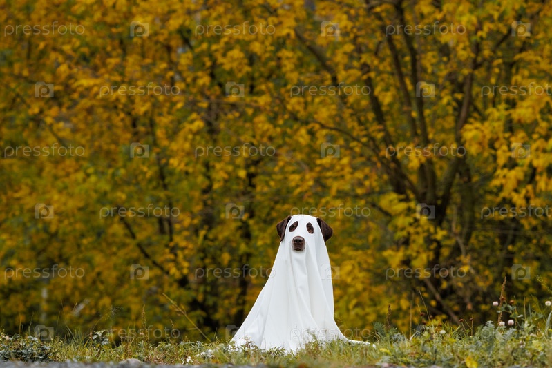 Милый лабрадорский пес, одетый в костюм призрака на Хэллоуин