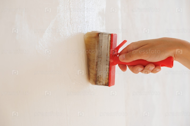 Мужчина держит щетку с клеем против легкой стены. нанесите толстый клей для обоев