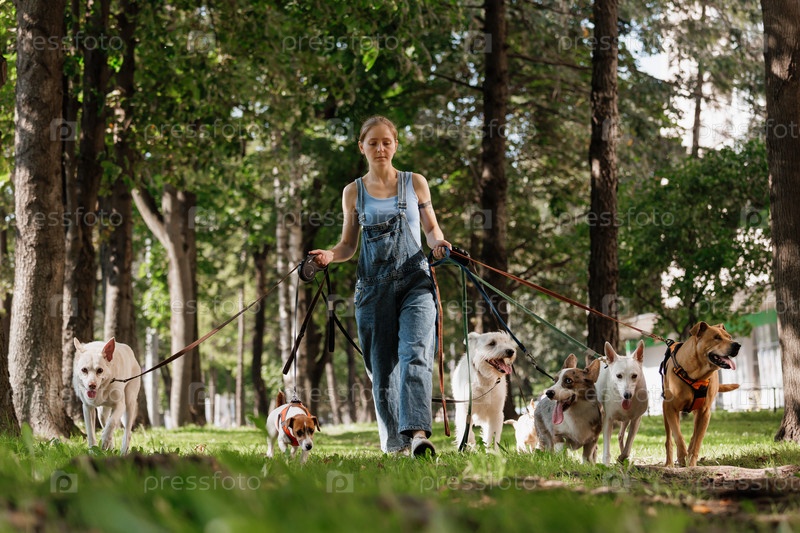 Женщина гуляет с собаками в парке