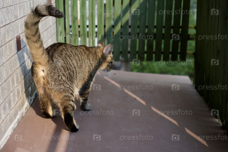 Милый кот сидит на балконе или террасе. Близкий портрет коричневого питомца
