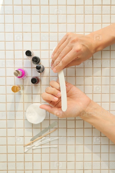 Вид сверху на женщину, делающую маникюр дома, заботясь о ногтях и руках