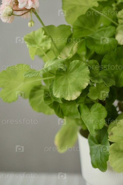 Зеленый куст растения герань в большом легком горшке