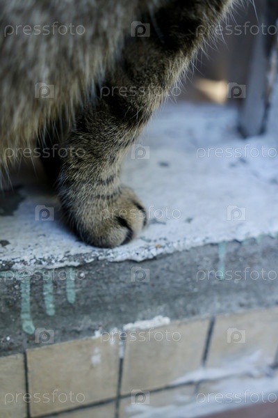 Полосатый кот сидит на балконе, крупный снимок пушистой лапы питомца