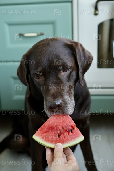 Собака лабрадор-ретривер ест арбуз. Домашний питомец смотрит на фрукты. Животное в кухне ждет пищи