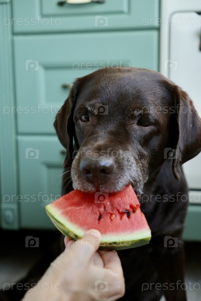 Собака лабрадор-ретривер ест арбуз. Домашний питомец смотрит на фрукты. Животное в кухне ждет пищи