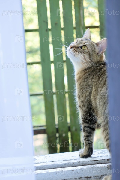 Полосатый кот на балконе, вид из комнаты домашнего питомца, гуляющего по природе