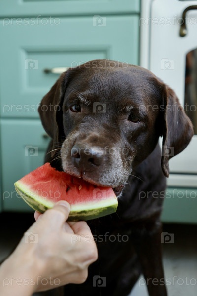 Собака лабрадор-ретривер ест арбуз. Домашний питомец смотрит на фрукты. Животное в кухне ждет пищи