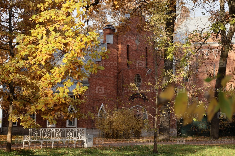 Осенний парк с желтыми деревьями и упавшими листьями. место для прогулок и отдыха