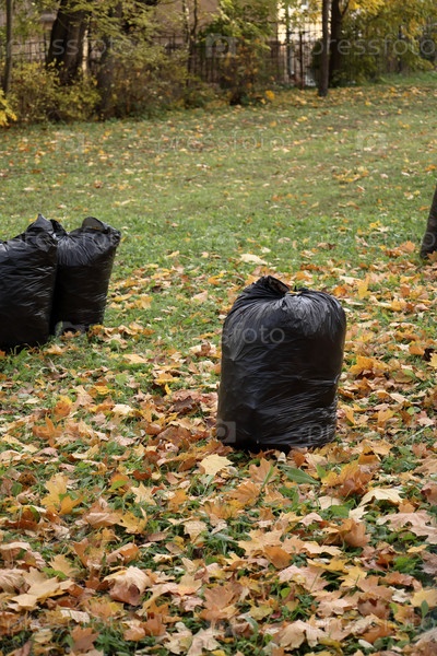 Мусор в черных пластиковых пакетах в саду, во дворе. уборка территории дома в осенний сезон