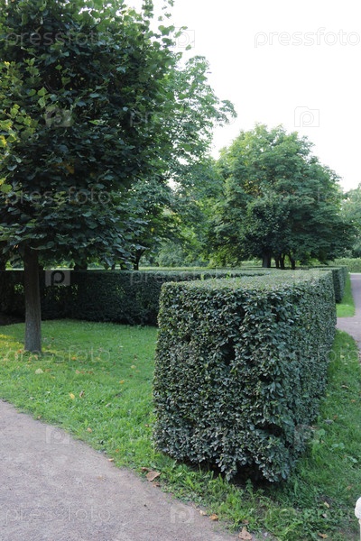 Образно подстриженные кустарники в общественном парке, ландшафтный дизайн.Петровский парк, Санкт-Петербург