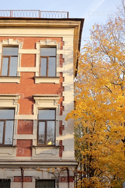 Фасад исторического здания - дерево с осенними желтыми листьями. кирпичный дом историческая архитектура
