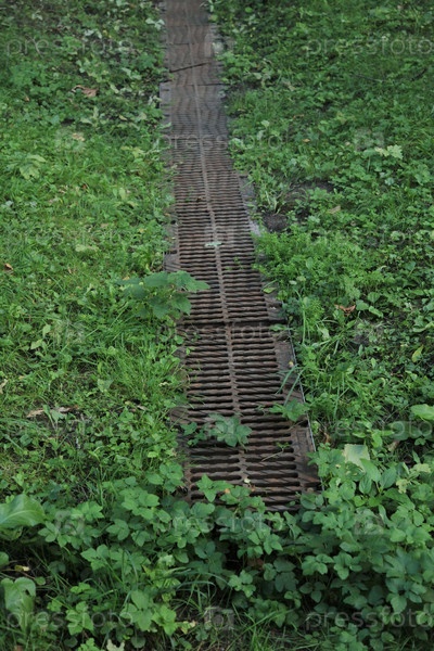 Железные ворота дренажной системы для слива ливневых вод в зоне парка рядом с зеленой лужайкой