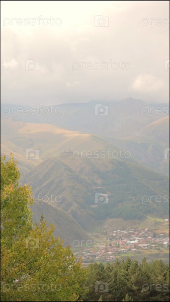 Вид на горы и деревья, ветровые колебания листьев