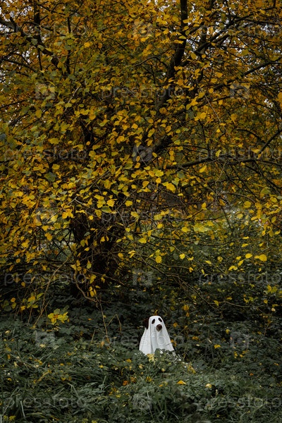 Лабрадорская собака, одетая как призрак Хэллоуина, питомец в белом плаще