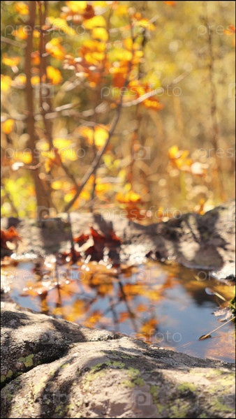 Отражение в воде, горный пепел с красными ягодами отражается в небольшой луже